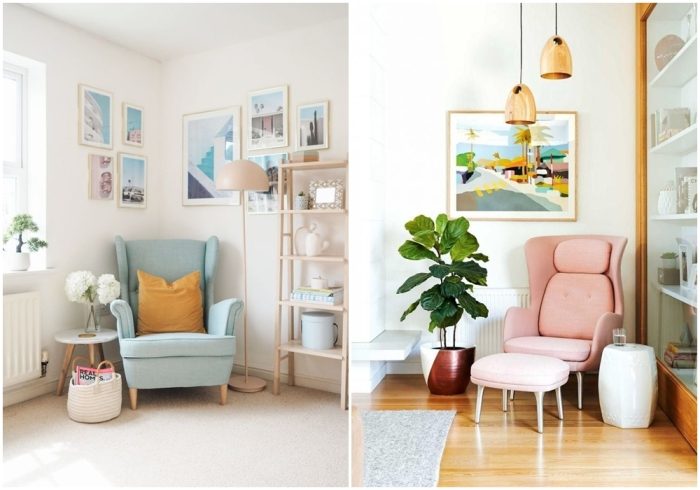 Дополните один из углов гостиной креслом.