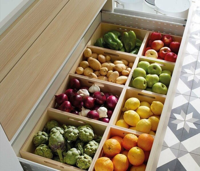 Один из выдвижных ящиков может быть выделен специально для этой цели, лучше выбрать наиболее глубокий и широкий ящик. В нём можно организовать разные секции для различных видов продуктов или использовать контейнеры для более удобного разделения. Их также можно выбрать деревянными или плетёными. Даже пластиковые контейнеры подойдут для жилых целей. Выдвижные ящики — это отличное решение, так как они позволяют легко доступиться к продуктам и упорядочить их, и при этом не давать шелухе или грязи выпасть на пол кухни, оставляя её чистой.
