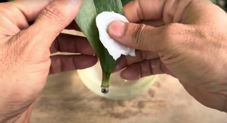 Используйте профильтрованный питательный настой для протирания листьев орхидеи с помощью ватного диска. Такая обработка поможет избавиться от грибка и предотвратит увядание листа.
