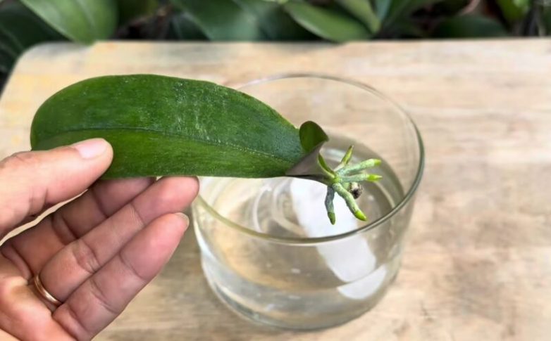 Следующим шагом поместите лист в стакан с питательным средством, чтобы вода лишь слегка касалась основания листа. Будет достаточно всего 30 минут, чтобы лист получил все необходимые ему вещества для активного корнеобразования.