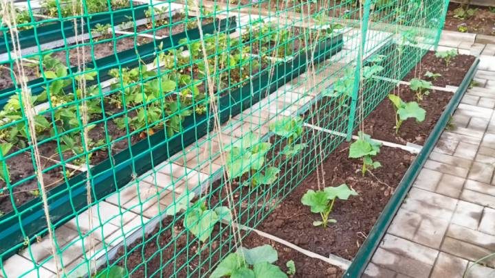 Финальный штрих — это подвязка огурчиков. Оберните рассаду джутом, натяните и привяжите к сетке сверху. Тогда огурец начнёт расти только вверх, а шпалера будет вся равномерно покрыта лианами!