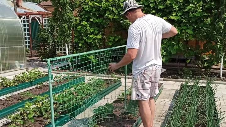 Только взгляните, какую красоту придумал умелец-огородник! Из труб, сетки и шпагата он собрал полноценную шпалеру для огурцов. Более того — конструкция разборная, а значит, её можно поставить только на сезон и убрать на зиму.