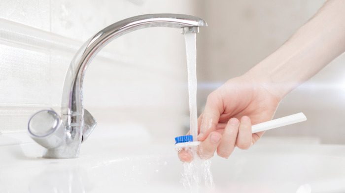 Зубную щётку просто достаточно ополоснуть под проточной водой.