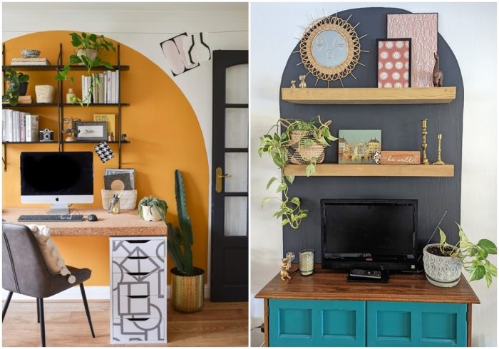 Фон в виде арки — уникальный способ выделить полки и сделать их ещё более заметными, поскольку он придаёт пространству большую глубину и объёмность, а цветной акцент привлекает внимание, делая его ярким визуальным центром. Контраст между аркой и полками также придаёт пространству ощущение структурированности, особенно, если полка предназначена для демонстрации книг, фотографий или сувениров. Это, безусловно, необычный и креативный подход, который станет самой настоящей изюминкой в интерьере.