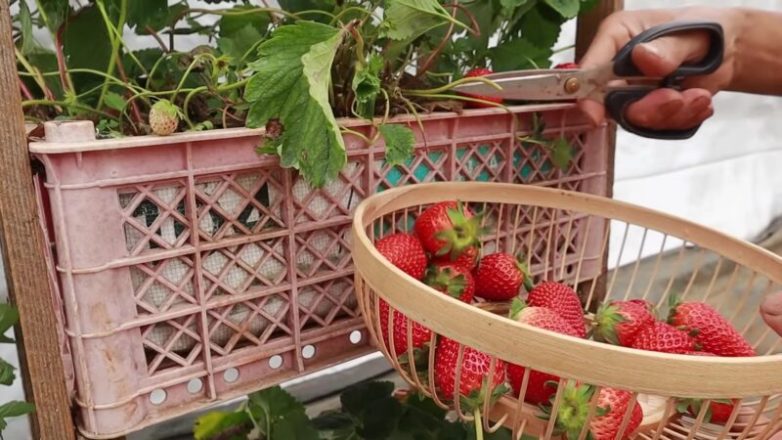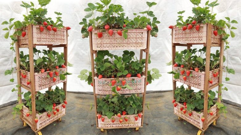 К примеру, клубнику можно выращивать в многоярусных стеллажах, сделанных из пластиковых ящиков. Такой способ облегчает уход за посадками, а также позволяет экономить место на участке без ущерба для количества урожая.