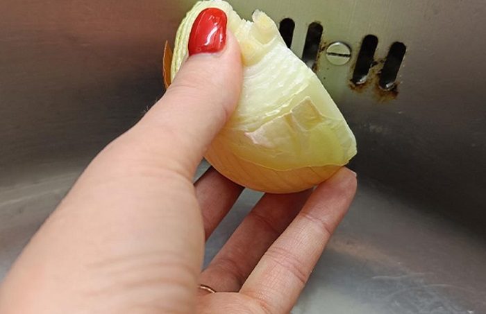 Возьмите луковицу, разрежьте ее пополам и протрите металл половинкой овоща. За счет того, что в состав лука входят натуральные кислоты, он с легкостью удалит загрязнения и сделает поверхность блестящей.