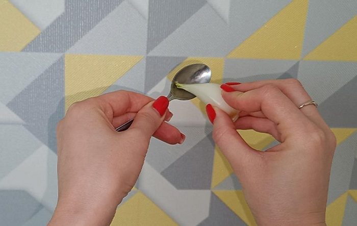 Натрите половинкой лука металлическую ложку.