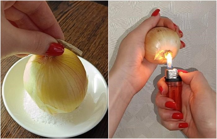 Храните лук в соли и поджигайте корешки
