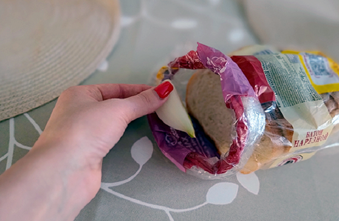 Положите кусочек лука в пакет с хлебом.
