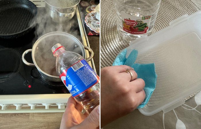 Все, что вам понадобиться — столовый уксус. Смочите им тряпичную салфетку и тщательно натрите контейнер изнутри. Запахи исчезнут без следа. А благодаря антисептических свойствам уксуса хранение ваших контейнеров станет еще более гигиеничным.