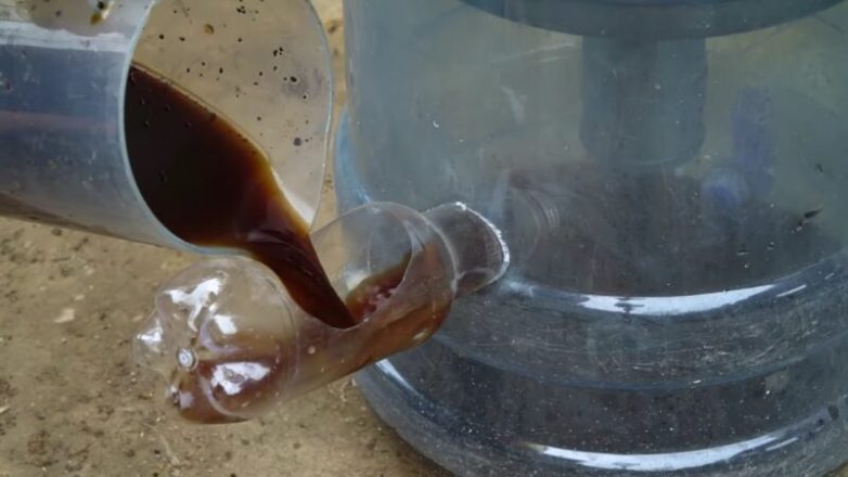 В подготовленном отверстии горлышком внутрь разместите бутылку объемом 0,5 литров. В боковой части маленькой бутылки сделайте отверстие, через которое будет удобно наливать воду.