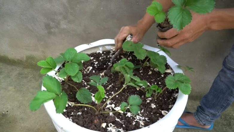 Наполните чашу питательным грунтом, добавьте удобрения и высадите кустики клубники.