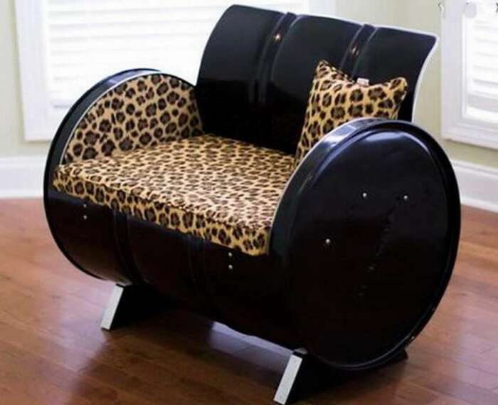 Например, удалив часть бочки с помощью болгарки, покрасив в яркий цвет, приделав ножки и удобное сиденье из дерева или ткани, добавив подушки на дно, можно превратить ее в уютное кресло. Оно станет прекрасным дополнением к террасе или гостиной.