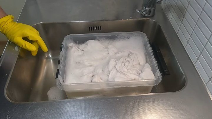 Теперь наберите таз горячей воды (из-под крана) около 5 л. Добавьте 0,5 стакана белизны и примерно 2-3 ст. л. любого средства для мытья посуды.