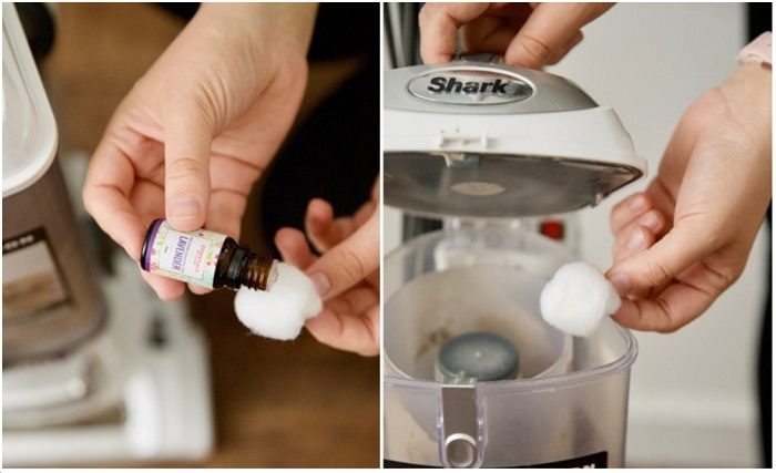 Смочите кусочек ваты эфирным маслом и положите в пылесос.