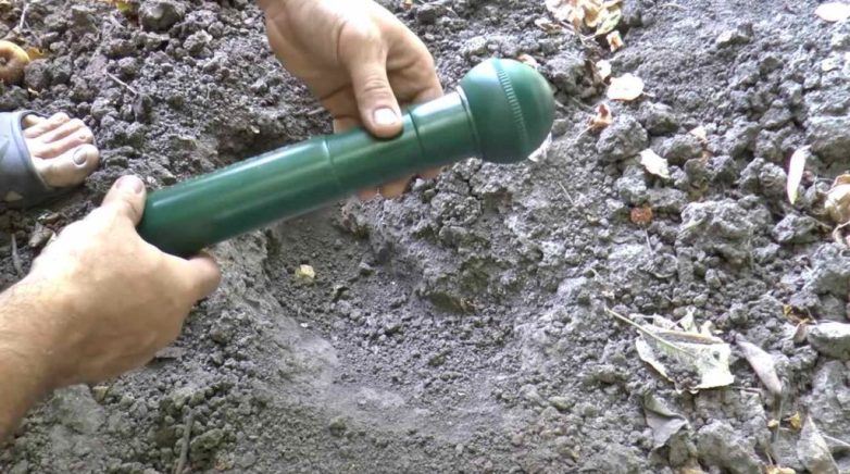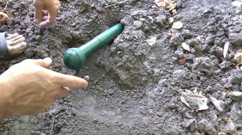 Вставляем батарейку в устройство, после чего помещаем сам отпугиватель в нору крота. Через некоторое время животное должно вылезти из своего запасного выхода, и вам останется его только поймать.