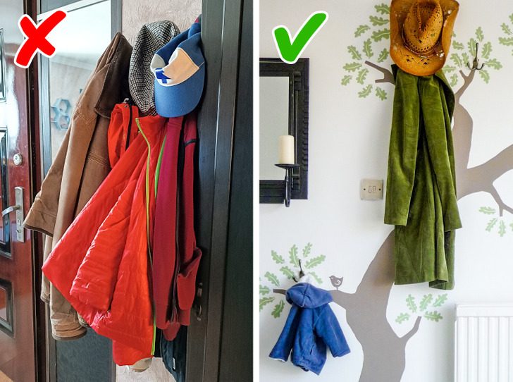 В некоторых прихожих просто недостаточно пространства, чтобы втиснуть туда шкаф для одежды. Но если повесить на стену только одну вешалку, груда одежды и сумок на ней будет захламлять помещение. Можно разместить крючки на разных уровнях по всей стене и вешать на них только по одному предмету. Так и одеваться будет проще, и прихожая будет выглядеть аккуратнее.