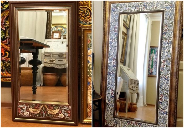 Зеркальная рама, изготовленная из плитки – оригинальный и красочный элемент декора, который отлично впишется в абсолютно любое помещение и интерьер. Главное преимущество такой рамы заключается в том, что она может быть изготовлена из абсолютно разной плитки будь то стекло, керамика или металлокерамика. Главное проявить креатив и фантазию в дизайнерских решениях. Плитка может быть выложена самыми разнообразными узорами, создавая более современный вид с геометрическими формами и чёткими линиями, или в более традиционном стиле с классическим, красочным или цветочным орнаментом. Ко всему прочему, такие рамки станут отличным решением придать помещению контраст и текстуру.