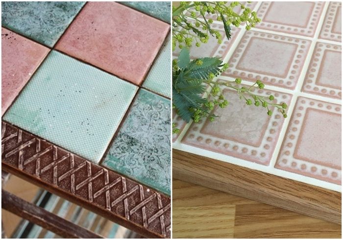 Старый стол можно превратить в дизайнерский с помощью остатков или разбитой плитки, просто приклеив к столешнице, тем самым придав уникальный, красочный и стильный вид. Кроме того, сочетая различные цвета и узоры плитки, можно создать уникальную вещь, которая с первых же минут привлечёт восторженные взгляды друзей и знакомых.