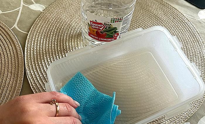 Со временем в пластиковых контейнерах появляется затхлый запах. Если он не исчезает даже после мытья ароматным средством для посуды, попробуйте протереть стенки емкости тряпкой, смоченной в уксусе. Благодаря тому, что в его составе есть кислота, он нейтрализует неприятный запах. Кроме того, уксус обладает антисептическими свойствами, и убивает бактерии, которые являются причиной появления различных ароматов. Таким образом, обработка контейнеров уксусом не только устранит запахи, но также обеспечит более гигиеничные условия хранения посуды!