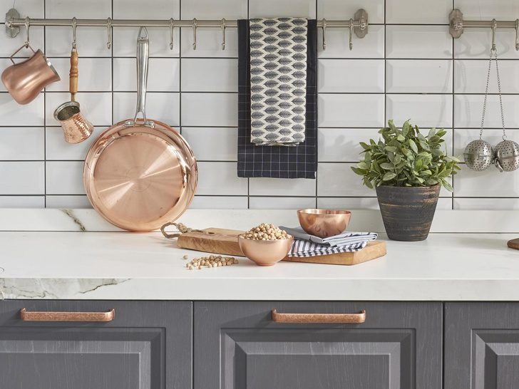 Еще один предмет, на котором не стоит экономить — столешницы.Выбирайте прочные, качественные материалы. Столешница из мрамора или гранита мгновенно преобразит вашу кухню, а также ванную. Разнообразие узоров и цветов натурального камня добавят роскоши в интерьер. А при правильном уходе и выборе специальных средств поверхности из камня будут служить вам много лет.