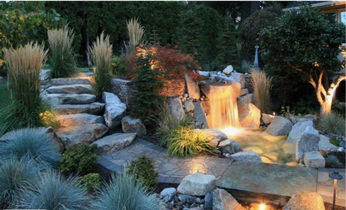 Фундаментом такой композиции служат камни естественного происхождения, которые могут варьироваться от массивных валунов до мелкой гальки, вроде гранита, песчаника, известняка и сланца.