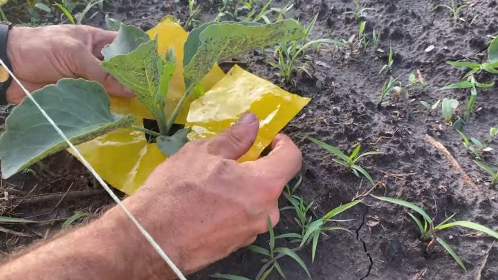Такой хитрый, но поразительно элементарный способ избавит от белокрылки в два счёта! Ничего опрыскивать не надо. Белокрылка сразу же прилипает и погибает, как только хочет приблизиться к капусте! Результат виден невооружённым глазом (см. фото ниже):