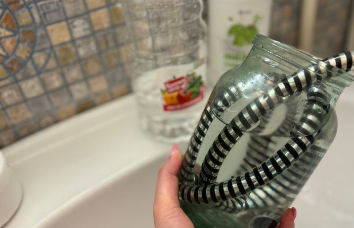 Чтобы отмыть шланг от душа, поместите его в банку и залейте уксусом. Лучше всего использовать яблочный уксус, так как он обладает хорошими моющими свойствами. Оставьте шланг в банке с уксусом на несколько часов, затем выньте и промойте водой.