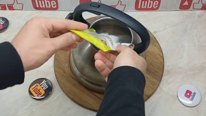 Закипятите воду в чайнике. Всыпьте туда 2 пакетика лимонной кислоты по 25 г каждый.