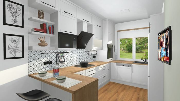 Многофункциональная рабочая поверхность и стол — отличный вариант для небольших кухонных помещений, поскольку они сочетают в себе функциональность рабочей поверхности и универсальность стола. Такой стол можно использовать для приготовления пищи, в качестве уголка для завтрака или в качестве места для приёма пищи всей семьёй. Существует несколько способов сделать стол «два в одном», например, использовать складной стол, который можно разложить до рабочей поверхности, или переносной кухонный островок, который также может служить столом. Такой предмет мебели не только экономит пространство, но и добавляет практичности небольшой кухне. Также можно использовать цельную рабочую поверхность в качестве обеденного стола, главное сделать её таким образом, чтобы рядом с ней можно было удобно и практично разместить стулья.