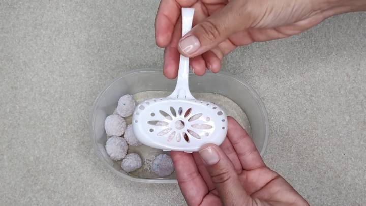 Перемешайте смесь. Зубная паста скрепит всё вместе. Теперь руками (работайте в перчатках!) сформируйте небольшие шарики. Оставьте их просушиться на 2-3 часа, чтобы они стали твёрже.