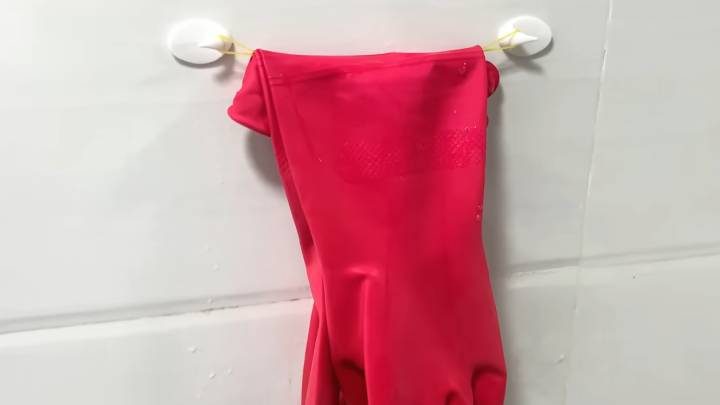 После того как закончили уборку, не кладите перчатки в раковину — они будут долго сохнуть. Прикрепите самоклеящиеся крючки на стену, а между ними — резинку. Теперь перчатки удобно повесить на сушку!