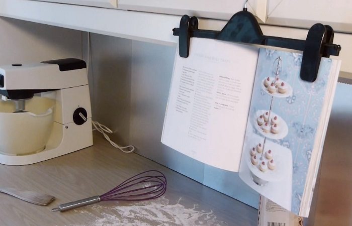 Большинство хозяек сейчас готовят по видео-рецептам из интернета, но есть и те, кто, по старинке, пользуется кулинарными книгами. Если вы входите во вторую категорию, воспользуйтесь следующей хитростью. Возьмите обычную вешалку для одежды, повесьте ее на ручку шкафчика, а затем закрепите страницы книги с помощью прищепок. Так книга будет находиться на уровне глаз, и вам не придется постоянно касаться ее грязными руками в процессе готовки. Очень удобно. Главное – следить, чтобы книга не слишком много весила, иначе страницы могут порваться.