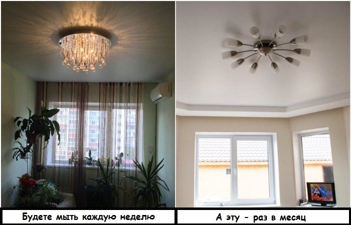 Если у вас в квартире высокие потолки, не «отяжеленные» натяжными конструкциями, откажитесь от идеи вешать стеклянную люстру. Чтобы до нее дотянуться и протереть пыль, придется ставить стремянку – простым пипидастром или шваброй с намотанной тряпкой обойтись не получится. Еще хуже, если люстра, по типу советских изделий, состоит из множества прозрачных элементов. На них очень хорошо видна пыль, которая копится с невероятной скоростью. Лучше отдавать предпочтение светлым минималистичным светильникам без декоративных элементов, так как они будут максимально простыми в уборке.