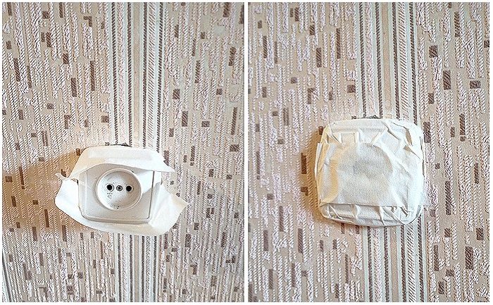 Сначала пройдитесь клейкой лентой по боковым частям розетки, а затем подверните ее внутрь и зафиксируйте сверху еще одним слоем. Получится своеобразный защитный короб, который убережет розетки от пыли и капель краски. Казалось бы, мелочь, но вы сможете избежать дополнительной уборки.