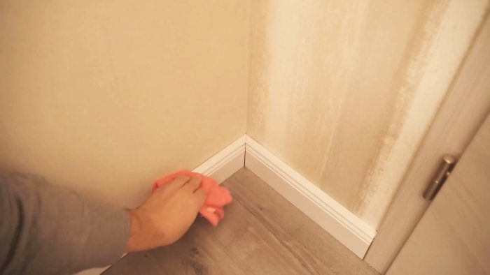Затем промокните кондиционером и вотрите его. Протирать можно самые загрязняющиеся и труднодоступные для вас места: плинтуса, углы и верхние полочки.