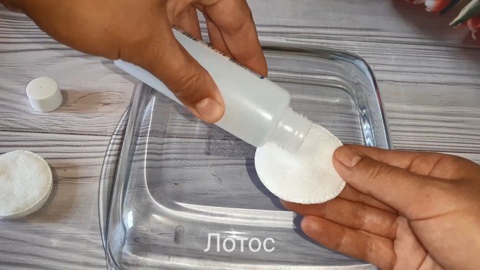 Все просто. В большинстве случаем клея на посуде остаться не должно. Но если он остался, то берем ватный диск и смачиваем его жидкостью для удаления лака с ногтей.