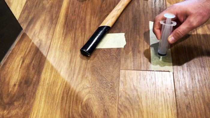 После этого набираем в шприц жидкие гвозди. Носик шприца нужно вставить в отверстие в ламинате, и выдавит клей.