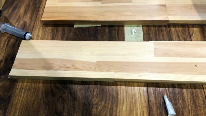 Затем убираем шприц, и укладываем по две стороны от отверстия дощечки, разместив их параллельно. На них кладем третью доску уже поперек, и нажимаем на нее. Эта конструкция позволяет задать клею точную плоскость, предотвратив получение бугорка. В итоге через отверстие под нагрузкой должно выйти немного клея. Если он не выдавился, то его мало, и нужно добавить.