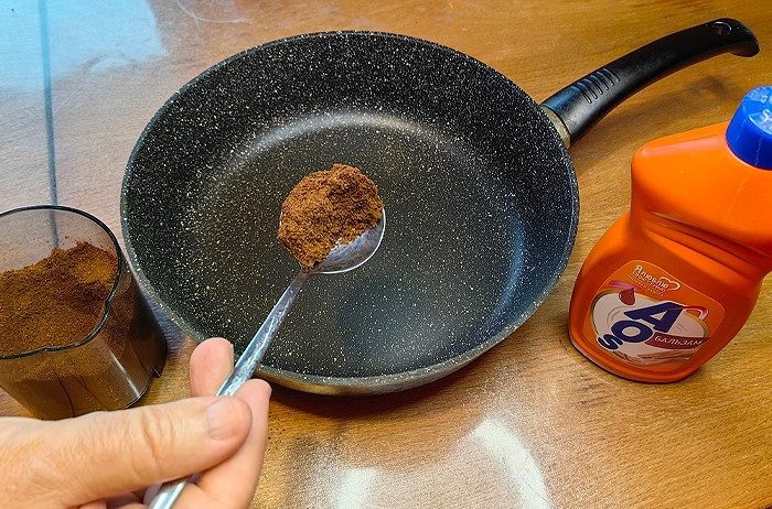 Чем чаще вы используете сковороду, тем больше на ней накапливается жира, нагара и прочих загрязнений, которые потом очень сложно убрать обычной губкой и моющим средством. Если вам не хочется использовать агрессивную бытовую химию, а не одно из известных вам подручных средств не справляется, попробуйте решить проблему с помощью кофейной гущи. Для этого смешайте три столовых ложки жмыха и одну столовую ложку средства для мытья посуды, нанесите толстым слоем на загрязненные участки и оставьте на пять минут, чтобы смесь подействовала. Затем хорошо потрите дно и стенки сковороды губкой и наслаждайтесь чистой посудой.