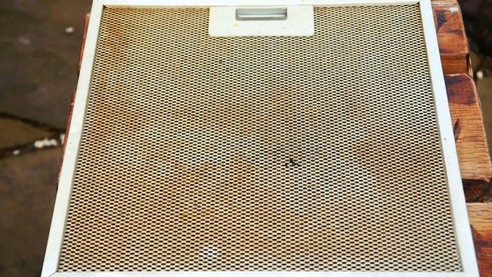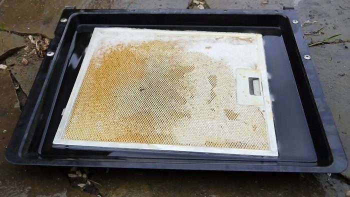 Снимите решетку с вытяжки и положите ее на противень. Перед очищением обязательно наденьте защитные перчатки и маску.