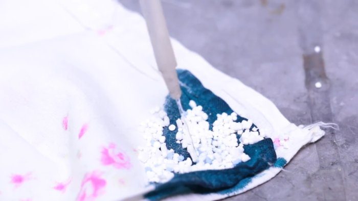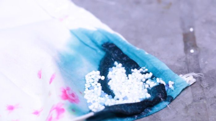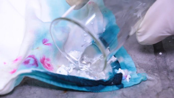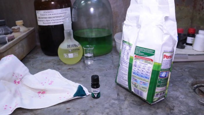 При выведении зеленки все же придется немного потереть вещь как при стирке. После этого остатки порошка, зеленки и перекиси нужно выполоскать водой.