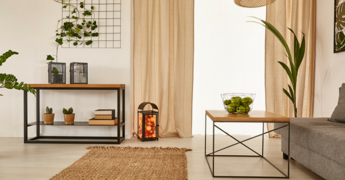 Ковры, подушки, пледы, изготовленные из натуральных материалов, а также шершавые поверхности (стены, полы, потолки) – всё это и многое другое придают помещению ту самую фактуру, без которой не обойтись. Плетёные элементы декора, такие как гобелены или корзины, также привнесут в интерьер фактурные элементы. Ко всему прочему, оригинальное сочетание фактур, создаёт уникальное и динамичное пространство. Гладкие изогнутые металлические ножки стола, имитирующие движение пламени, будут прекрасно контрастировать с грубой, неровной фактурой каменной или скалистой настенной панели. А вот добавление абажура в форме клубящегося грозового облака, создаст яркий визуальный образ, тем самым придав глубину дизайну комнаты.
