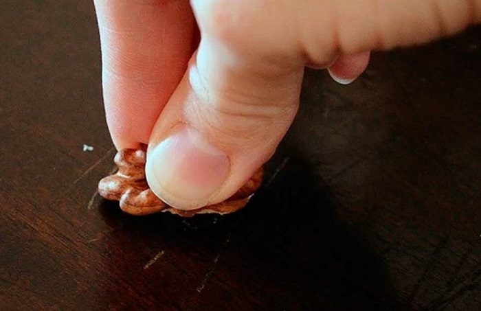 Деревянная мебель очень красивая и уютная, от нее веет настоящим теплом, но с точки зрения практичности, увы, это не самый лучший вариант. Со временем на поверхности неизменно появляются царапины и потертости, которые портят внешний вид. К счастью, есть один волшебный способ, который сможет сделать эти повреждения практически незаметными. Вам понадобится лишь ядро грецкого ореха. Да-да, вы все правильно поняли. Дело в том, что орех способен подкрасить царапины, благодаря чему их цвет сольется с оттенком дерева. Ловкость рук, и никакого мошенничества!