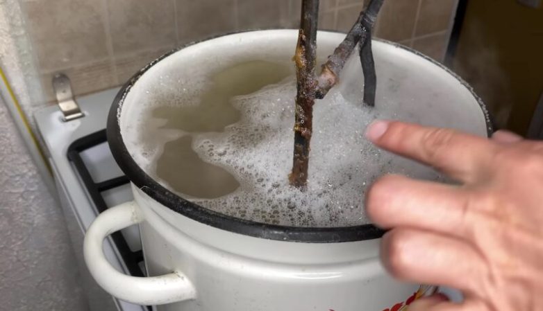 Поместите решетку в кастрюлю, поставьте на плиту и доведите воду до кипения (процесс займет порядка 30 минуту). Во время нагрева жир на решетке размягчится.