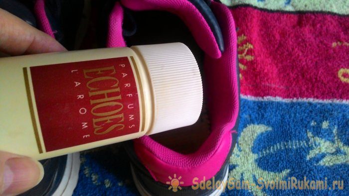 После того как обувь просохнет, возьмите немного ароматизированного талька и посыпьте внутри. Учтите, что носки нужно будет надеть светлые, чтобы на темных не оставалось следов талька.
