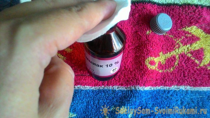 1. Смачиваем ватный тампон или салфетку нашатырным спиртом, протираем обувь внутри и снаружи (если позволяет материал).