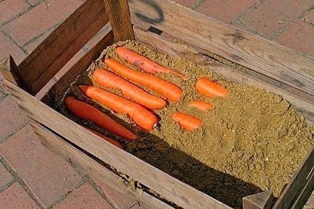 При хранении моркови предпочтительнее использовать деревянную тару. Перед закладкой на хранение обязательно удалить ботву с корнеплодов и дать срезам просохнуть. Для создания оптимальных условий выложить на дно емкости слой древесных опилок или соломы, а затем разместите овощи в один слой, следя за тем, чтобы они не соприкасались.
