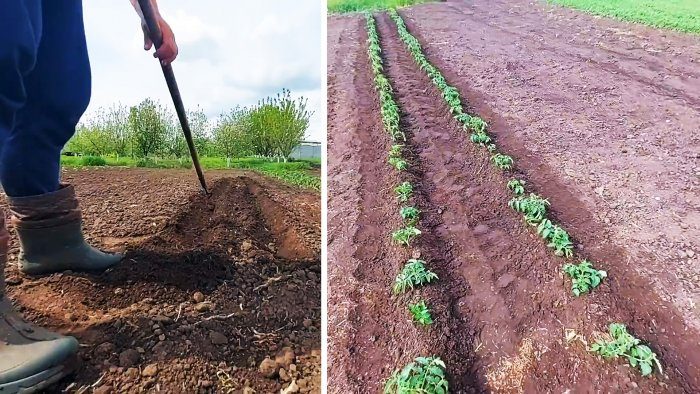 Под каждый ряд помидор тяпкой прорывается траншея. Расстояние между рядами делается 60 см. Если почва сухая, то вырытые грядки все же нужно хорошо залить водой.