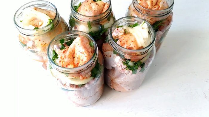 Повторите слои до тех пора, пока емкость не заполнится доверху. Плотно закройте банки с курицей крышками.